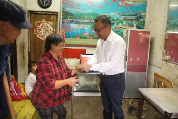 每到一戶困難家庭,陳區(qū)長和孔總都詳細詢問了困難村民的生活狀況和經(jīng)濟收入情況,看住房、生活設(shè)施,鼓勵他們要堅定脫貧信心、保持樂觀向上的生活態(tài)度。在五里鎮(zhèn)王店村貧困戶王國 軍家中,了解到王國 軍常年在外打工,其妻子獨自一人帶著智障兒子,想養(yǎng)兩頭母豬生崽,但又缺少資金購買母豬苗后,孔總當場捐出2000元幫助她解決豬苗錢問題,并希望王國 軍能回鄉(xiāng)到永和建設(shè)集團公司工作。