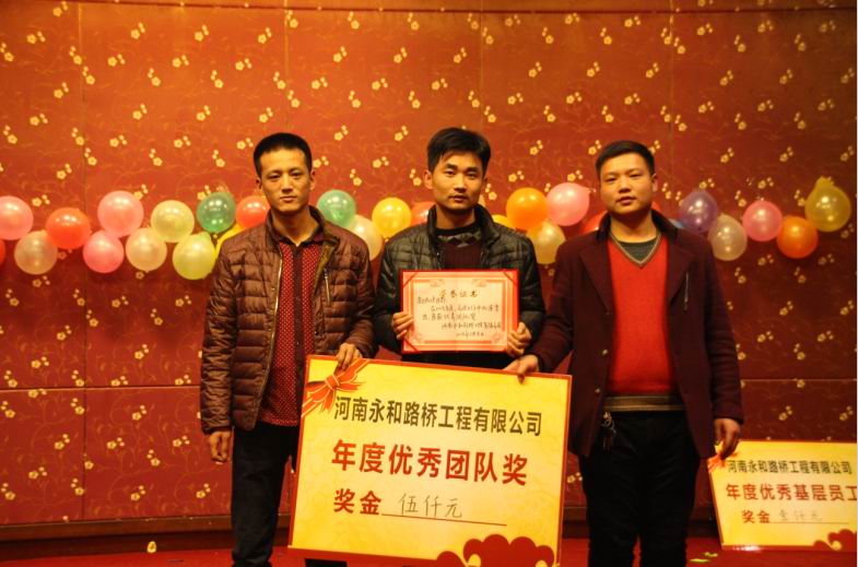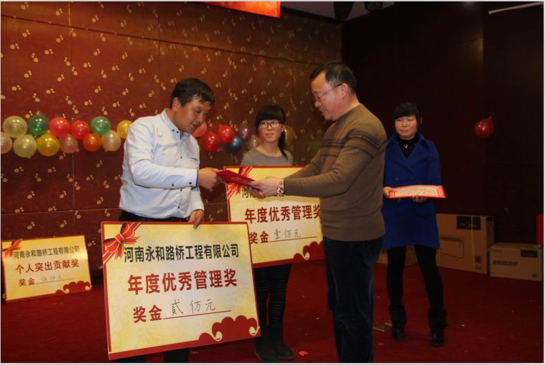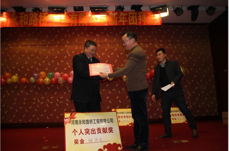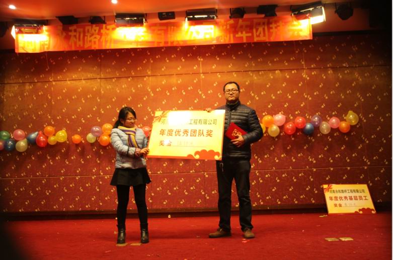 2016年2月4日晚,農(nóng)歷臘月26日晚,河南永和路橋工程有限公司在信陽市五星 級(jí)酒店中樂百花酒店隆重的舉行了2016年新春團(tuán)拜會(huì),本次團(tuán)拜會(huì)由公司全體員工及家屬、公司的合作伙伴、朋友等共同出席,大家歡聚一堂、把酒言歡、其樂融融。公司董事長孔總發(fā)表新年賀詞比代表公司對(duì)年度優(yōu) 秀個(gè)人及團(tuán)隊(duì)進(jìn)行了表彰。公司還為到場(chǎng)的每位小寶寶送上新年祝福和紅包,并準(zhǔn)備了抽獎(jiǎng)環(huán)節(jié)。大家歡歌笑語,一直將熱鬧、愉快的氛圍維持到午夜。圖為團(tuán)拜會(huì)期間頒獎(jiǎng)儀式